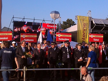 Der Oberbürgermeister Frank Szymanski begrüßte die Feuerwehrsportler aus 17 Nationen in Cottbus und gratulierte dem Präsidenten des Stadtfeuerwehrverbandes, Dr. Wolfgang Bialas, zu seinem Geburtstag.