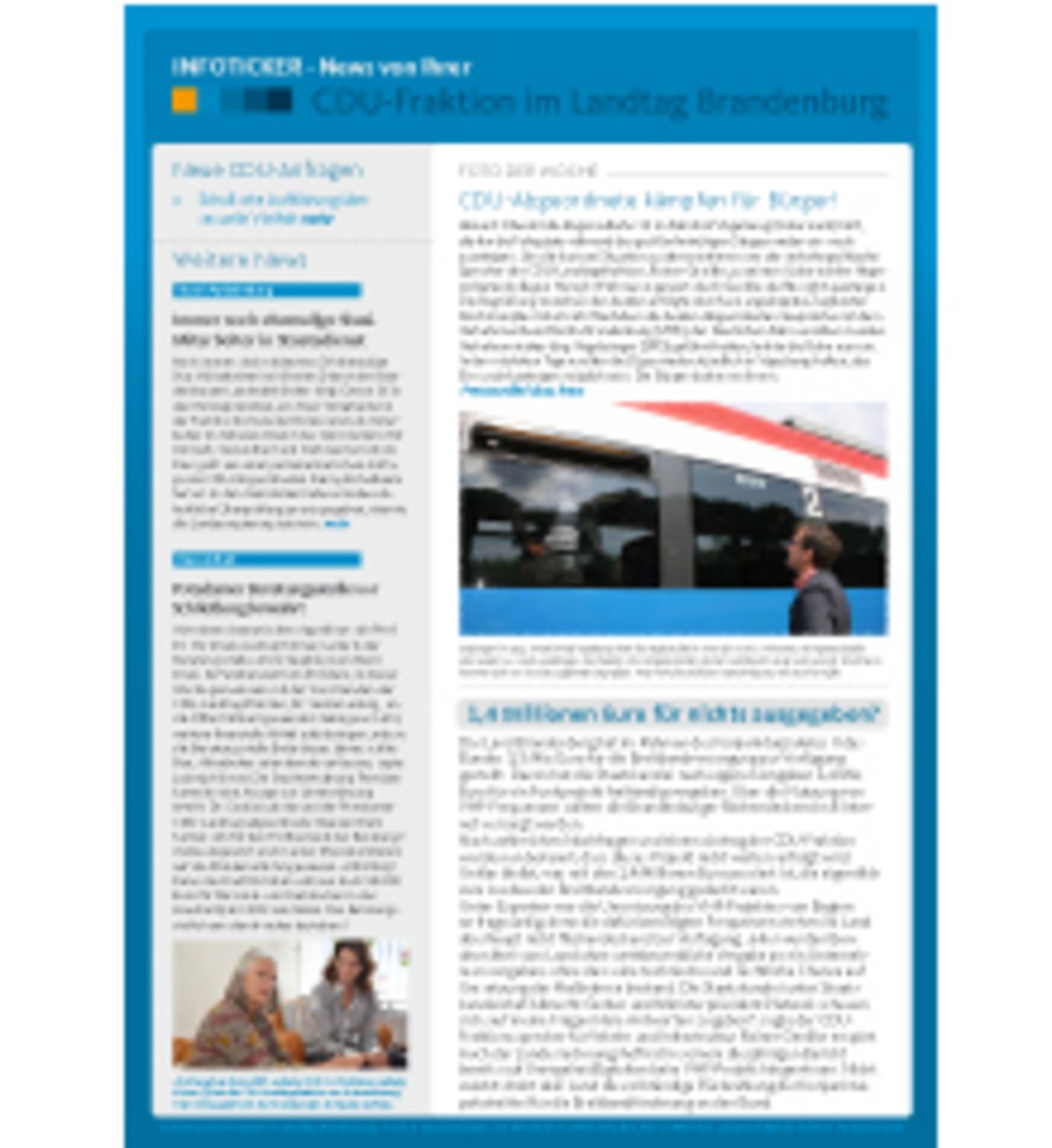 mit unserem INFOTICKER erhalten Sie heute die neuesten Nachrichten über die Arbeit der CDU-Fraktion im Landtag Brandenburg. Wir wünschen Ihnen eine angenehme Lektürezeit.