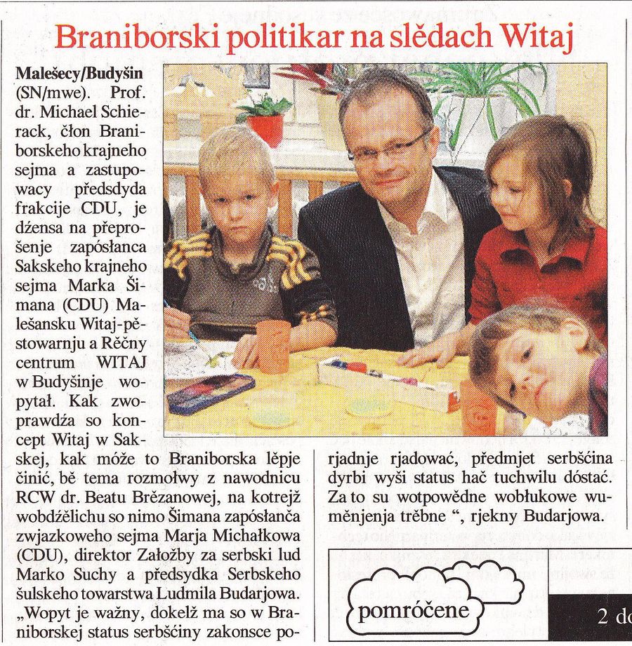 Übersetzung des Artikels „Braniborski politikar na sledach Witaj“. Serbske Nowiny vom 6. Dezember 2011.